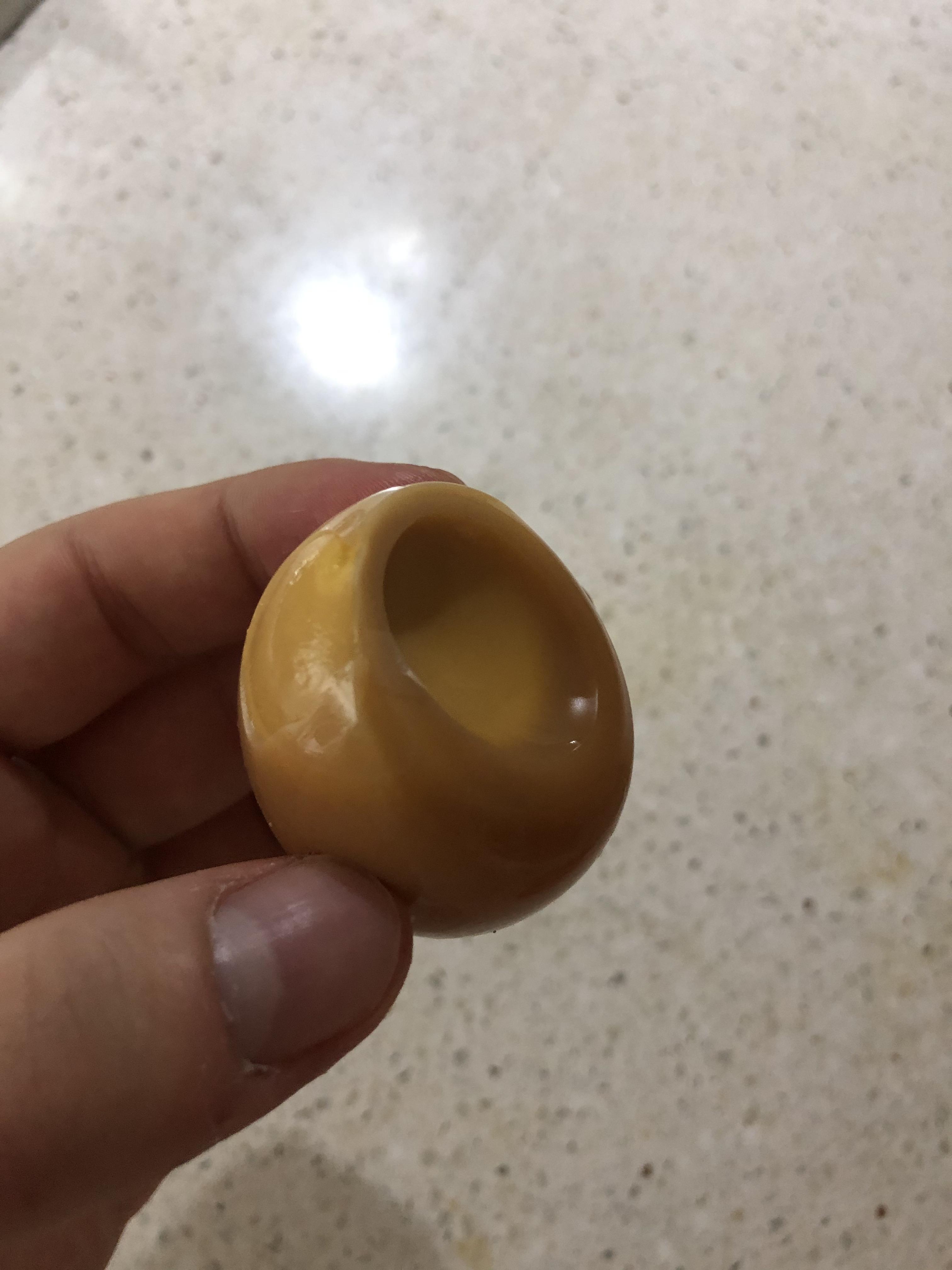 바닥에 살짝 치니까 바로 껍질에 금이 갑니다. 그상태로 위로 벗겨내면 저렇게 반이 깔끔하게 사라집니다. 삶은 계란도 잘 만들어서 식히면 깔끔히 벗겨지긴 하지만 이렇게 깔끔하게 쏙 벗겨지는 경험은 너무 신기했습니다. 껍질을 까니 흰자라고 불러야 하는데 검은색이니까 검은자가 아주 탱글탱글해보입니다